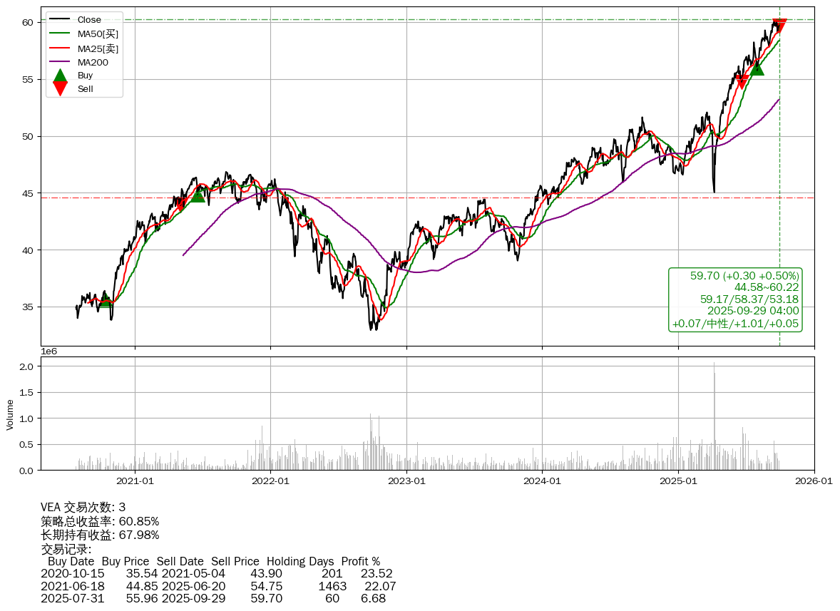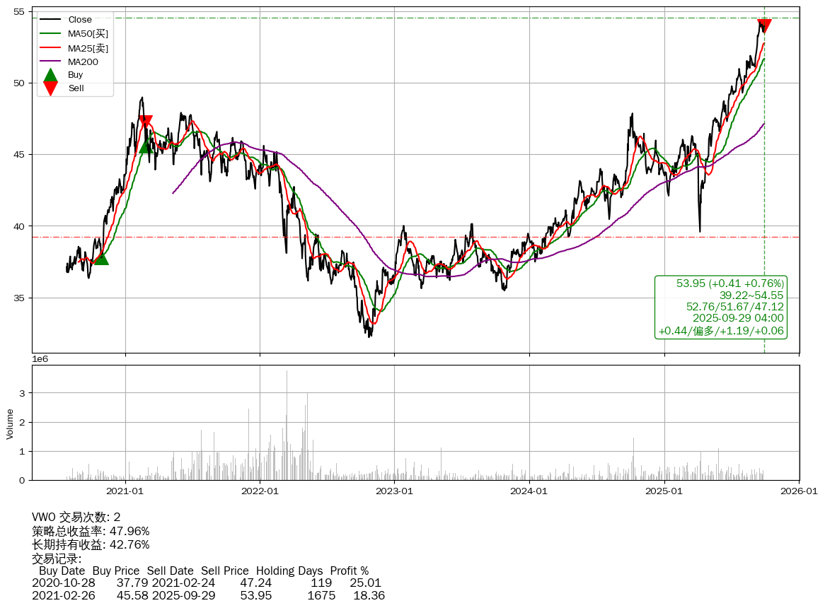 | 59 | ★VWO | +47.96% | +42.76% | +5.20% | 2 | +0.44/偏多/+1.19/+0.06 | 2020-07-27~2025-09-29 |