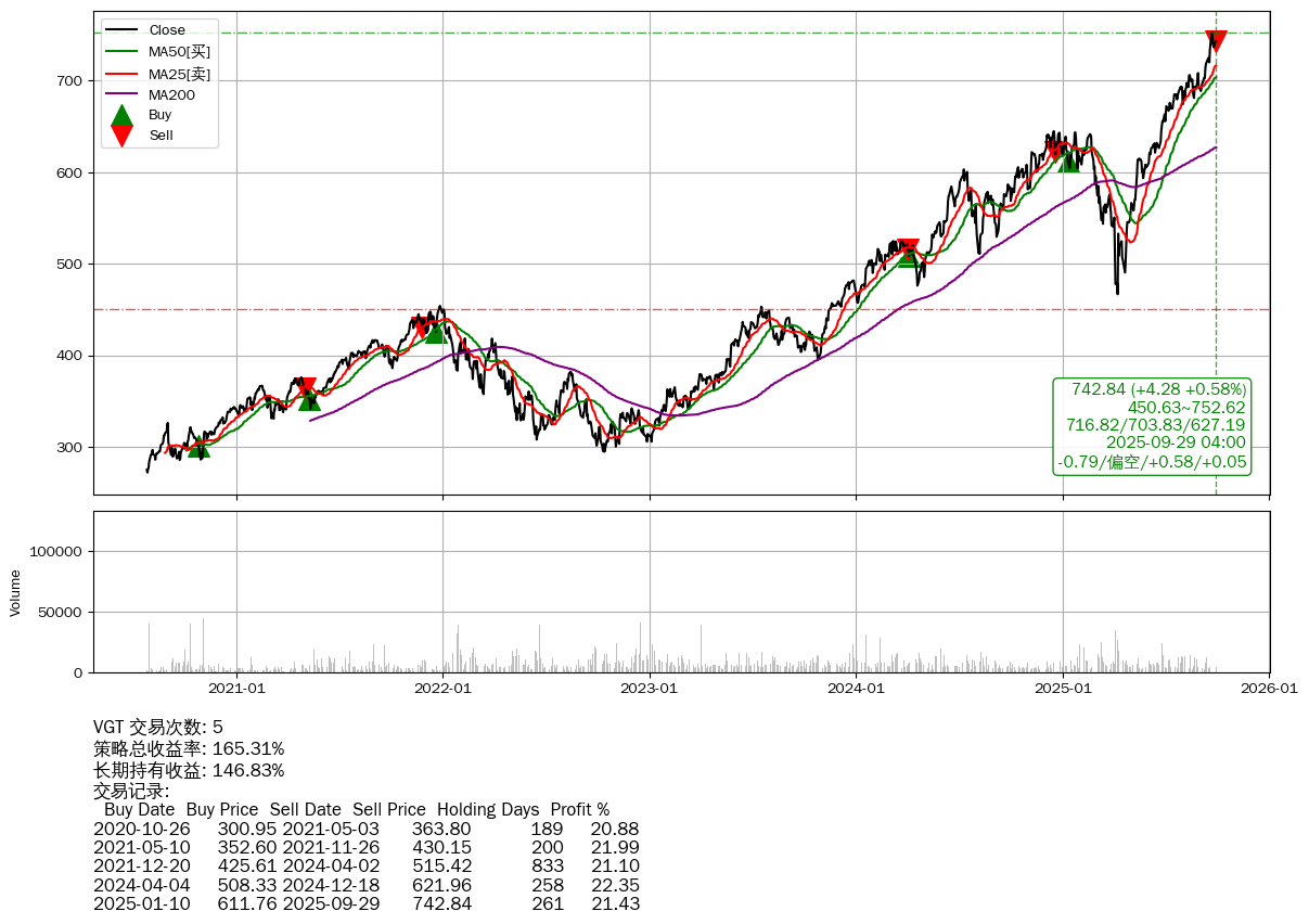 | 23 | ★VGT | +165.31% | +146.83% | +18.48% | 5 | -0.79/偏空/+0.58/+0.05 | 2020-07-27~2025-09-29 |