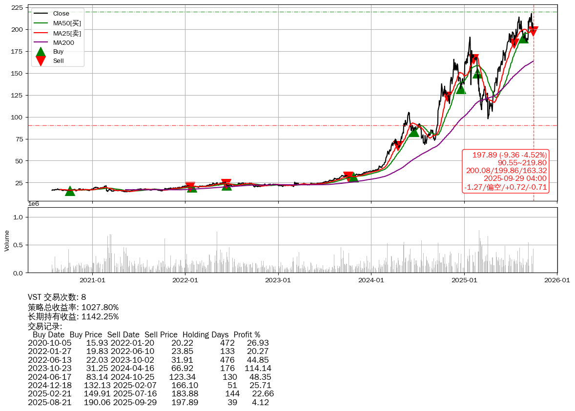 | 3 | ★VST | +1027.80% | +1142.25% | -114.45% | 8 | -1.27/偏空/+0.72/-0.71 | 2020-07-27~2025-09-29 |