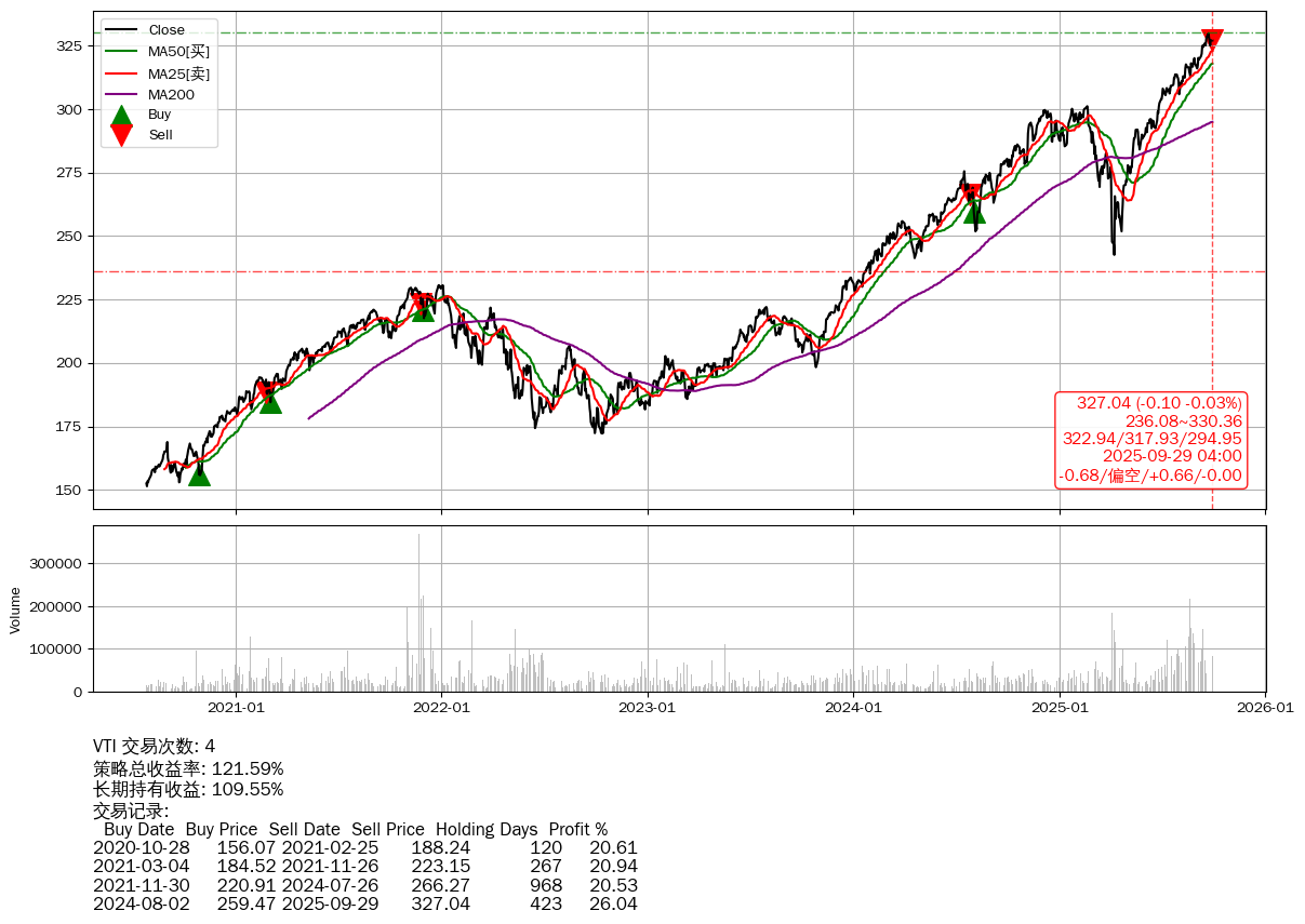 | 32 | ★VTI | +121.59% | +109.55% | +12.05% | 4 | -0.68/偏空/+0.66/-0.00 | 2020-07-27~2025-09-29 |