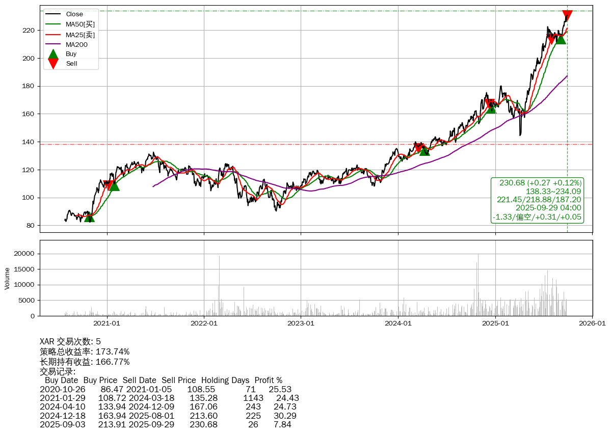 | 20 | ★XAR | +173.74% | +166.77% | +6.96% | 5 | -1.33/偏空/+0.31/+0.05 | 2020-07-27~2025-09-29 |