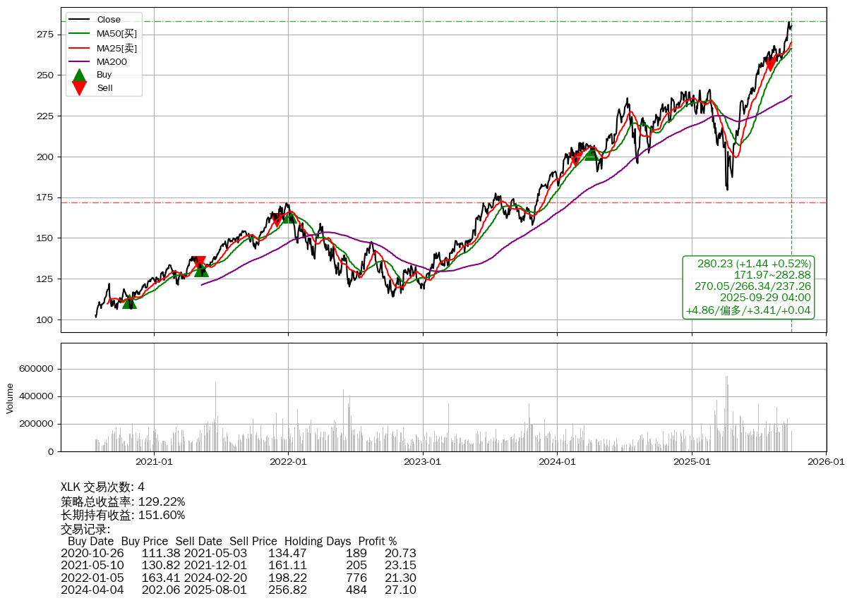| 28 | ★XLK | +129.22% | +151.60% | -22.38% | 4 | +4.86/偏多/+3.41/+0.04 | 2020-07-27~2025-09-29 |