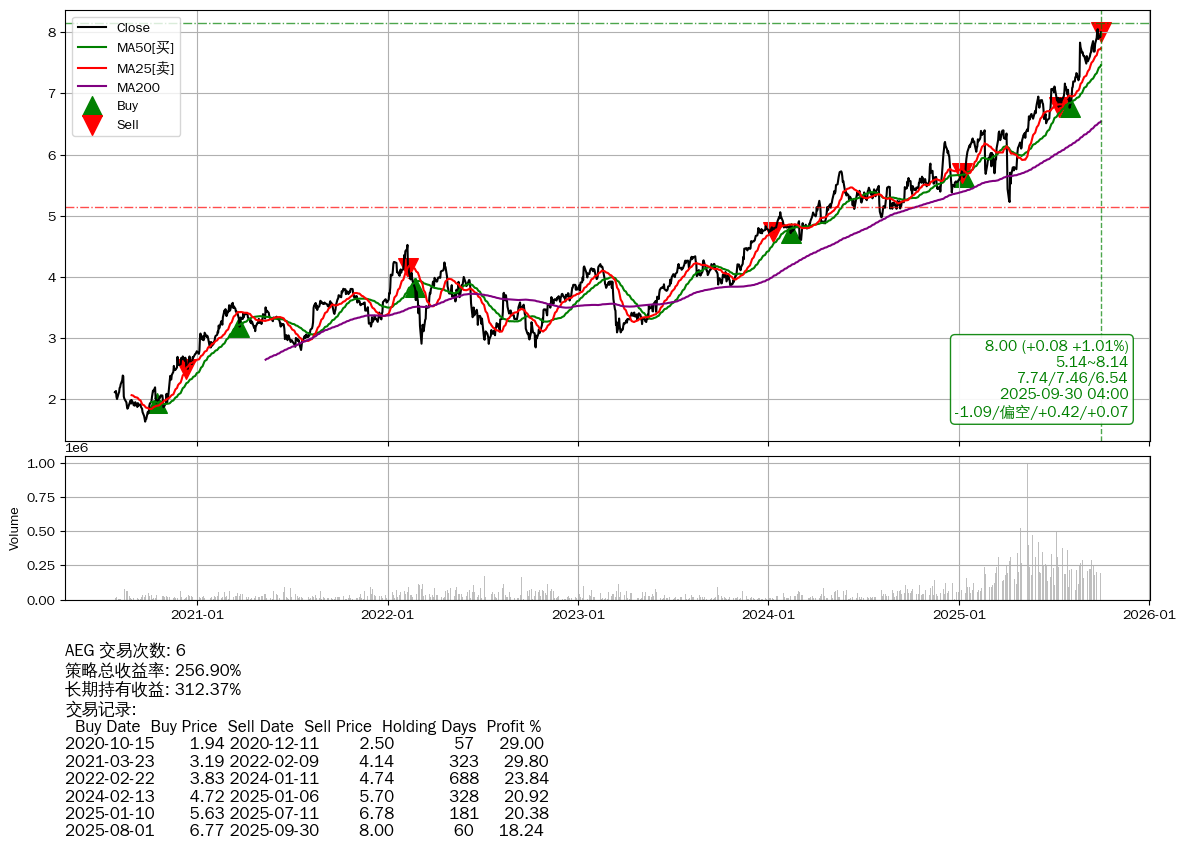 | 14 | AEG | +256.90% | +312.37% | -55.47% | 6 | -1.09/偏空/+0.42/+0.07 | 2020-07-27~2025-09-30 |