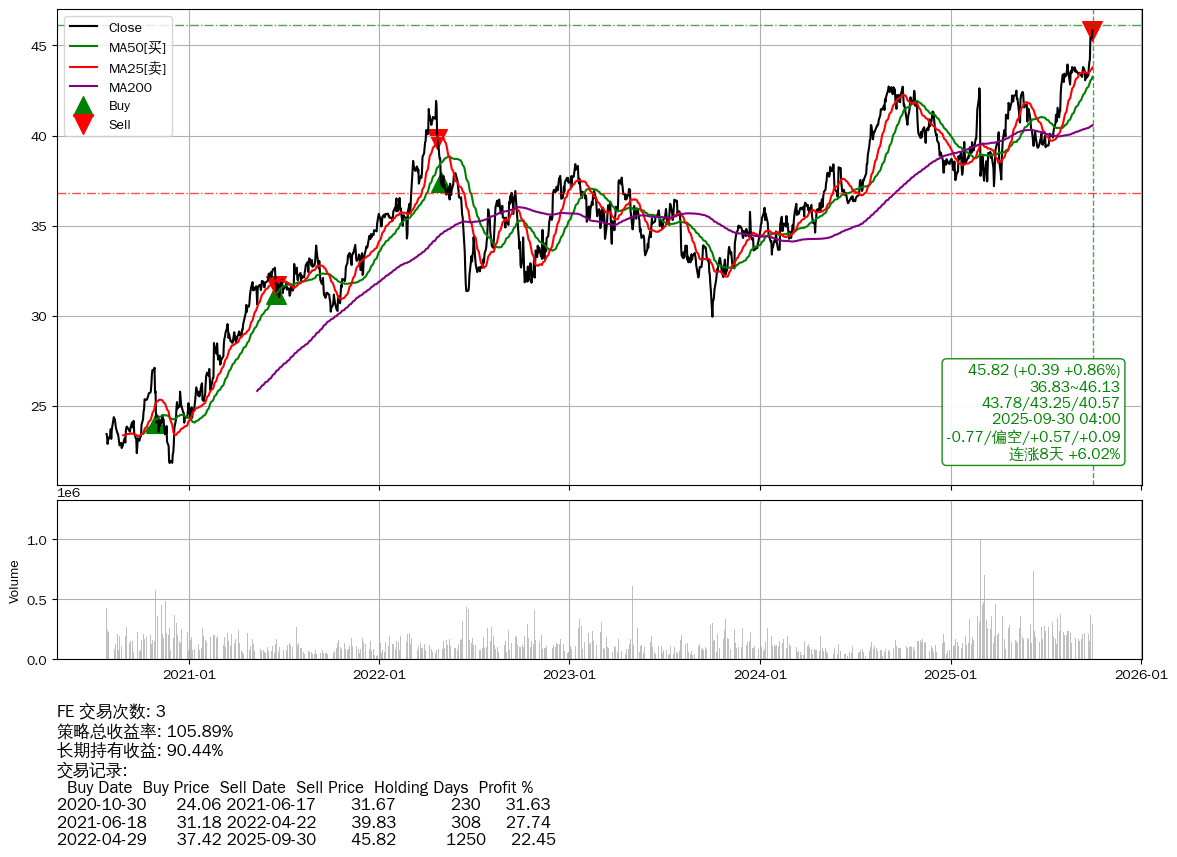 | 41 | ★FE | +105.89% | +90.44% | +15.45% | 3 | -0.77/偏空/+0.57/+0.09 | 2020-07-27~2025-09-30 |