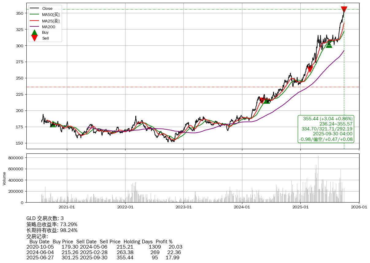 | 55 | ★GLD | +73.29% | +98.24% | -24.95% | 3 | -0.98/偏空/+0.47/+0.08 | 2020-07-27~2025-09-30 |