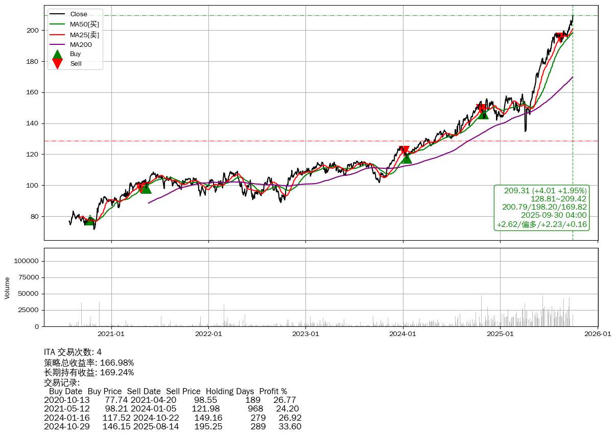 | 25 | ★ITA | +166.98% | +169.24% | -2.27% | 4 | +2.62/偏多/+2.23/+0.16 | 2020-07-27~2025-09-30 |