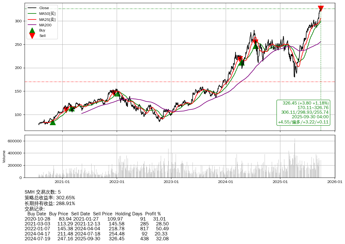 | 9 | ★SMH | +302.65% | +288.91% | +13.74% | 5 | +4.55/偏多/+3.22/+0.11 | 2020-07-27~2025-09-30 |