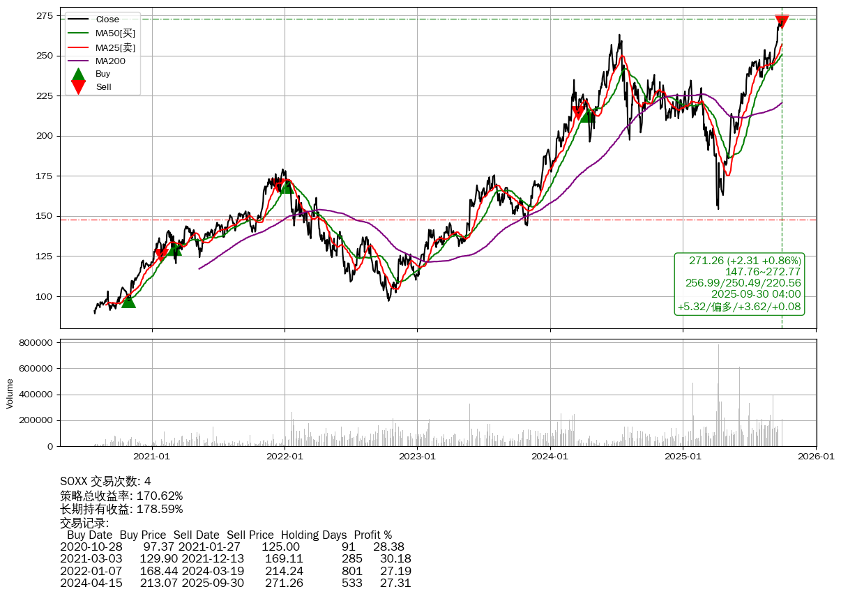 | 24 | ★SOXX | +170.62% | +178.59% | -7.97% | 4 | +5.32/偏多/+3.62/+0.08 | 2020-07-27~2025-09-30 |