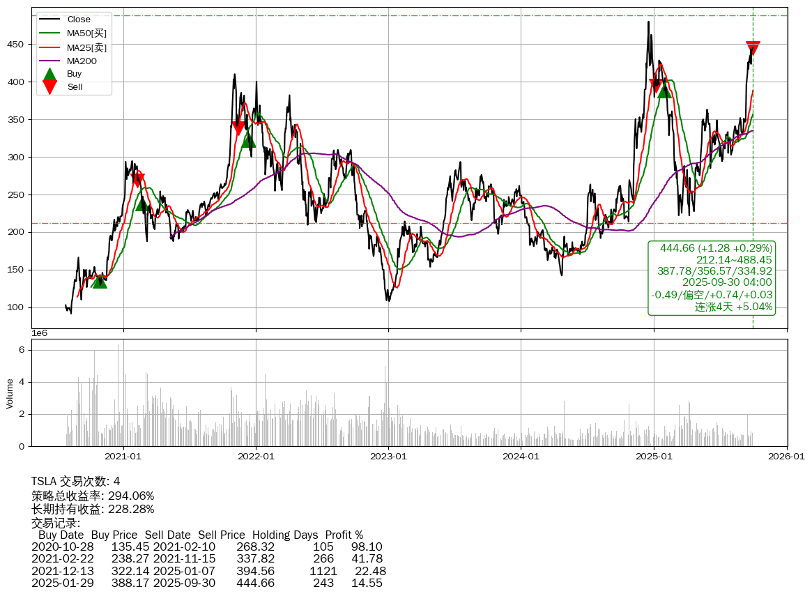| 11 | ★TSLA | +294.06% | +228.28% | +65.77% | 4 | -0.49/偏空/+0.74/+0.03 | 2020-07-27~2025-09-30 |