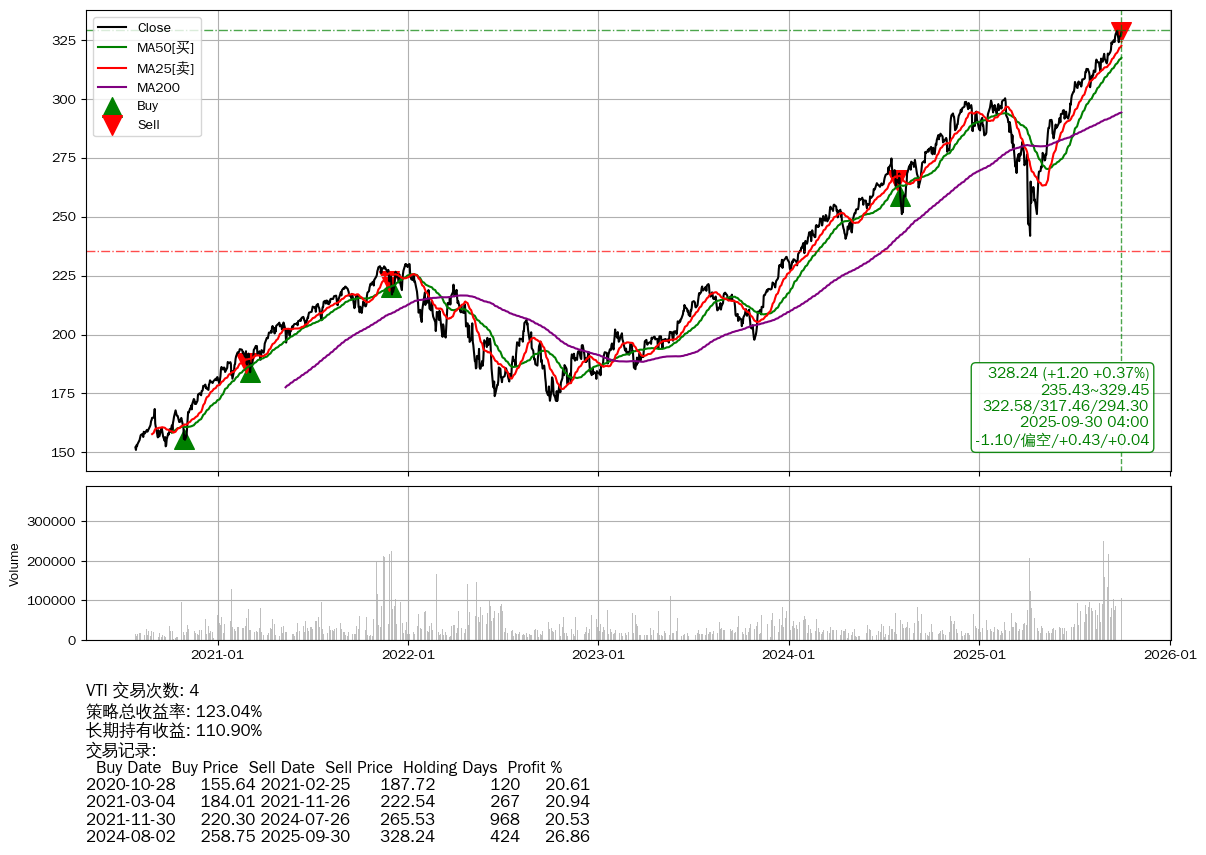| 34 | ★VTI | +123.04% | +110.90% | +12.14% | 4 | -1.10/偏空/+0.43/+0.04 | 2020-07-27~2025-09-30 |