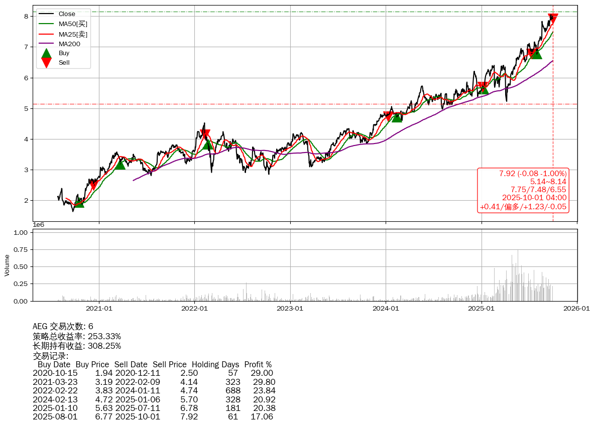 | 16 | AEG | +253.33% | +308.25% | -54.91% | 6 | +0.41/偏多/+1.23/-0.05 | 2020-07-27~2025-10-01 |