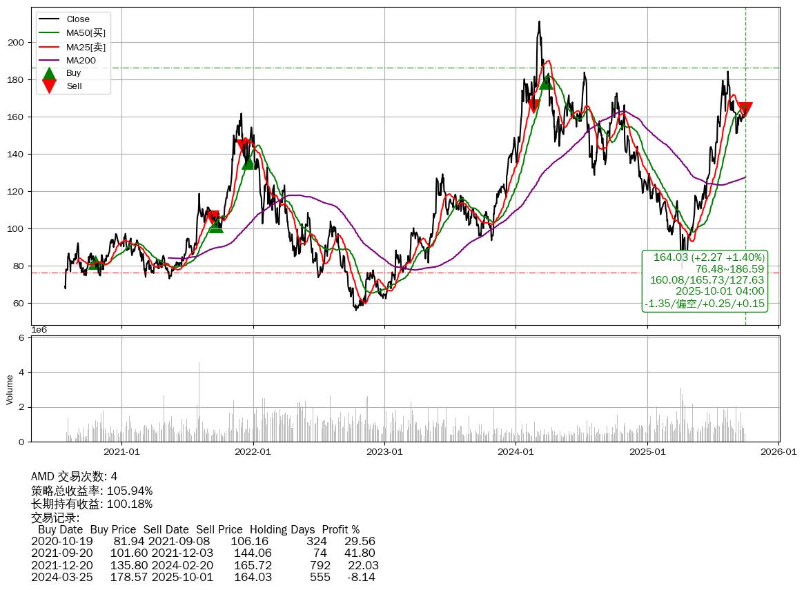 | 46 | ★AMD | +105.94% | +100.18% | +5.76% | 4 | -1.35/偏空/+0.25/+0.15 | 2020-07-27~2025-10-01 |