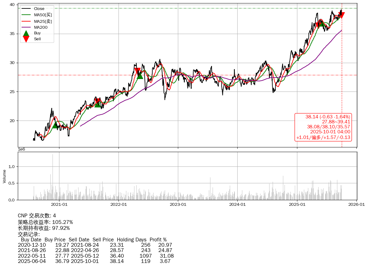 | 48 | ★CNP | +105.27% | +97.92% | +7.35% | 4 | +1.01/偏多/+1.57/-0.13 | 2020-07-27~2025-10-01 |