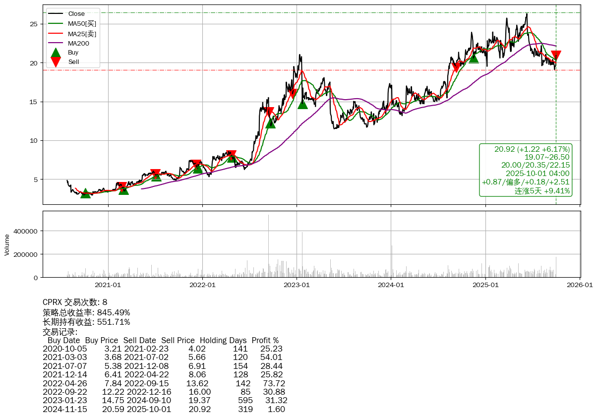 | 6 | 🟢CPRX | +845.49% | +551.71% | +293.77% | 8 | +0.87/偏多/+0.18/+2.51 | 2020-07-27~2025-10-01 |
