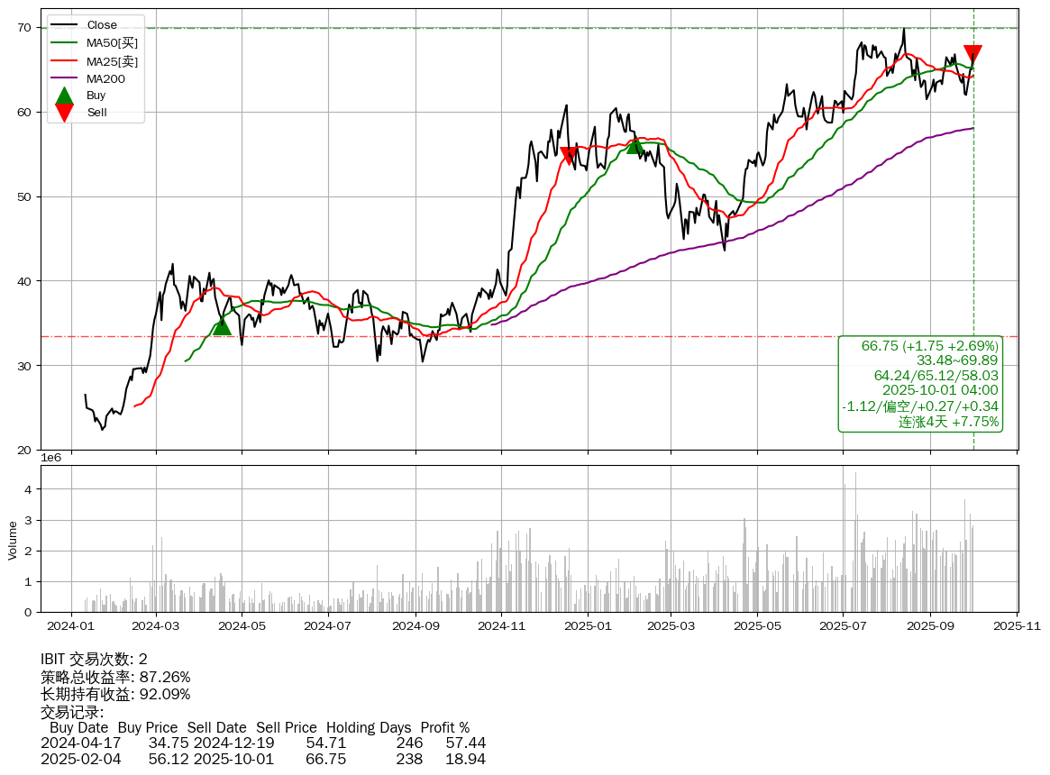 | IBIT | 2025-10-01 | 📈涨破 MA50 均线 📈连涨4天 +7.75% |