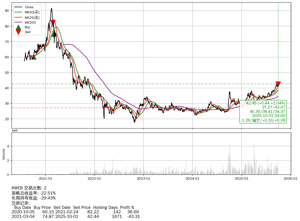 | 77 | ★KWEB | -22.51% | -29.43% | +6.92% | 2 | -1.26/偏空/+0.33/+0.08 | 2020-07-27~2025-10-01 |