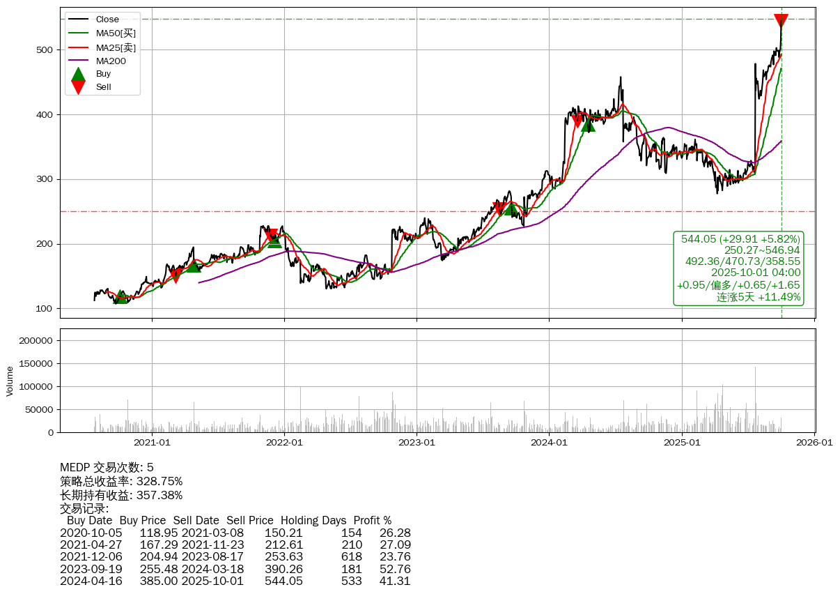 | 9 | 🟢MEDP | +328.75% | +357.38% | -28.62% | 5 | +0.95/偏多/+0.65/+1.65 | 2020-07-27~2025-10-01 |