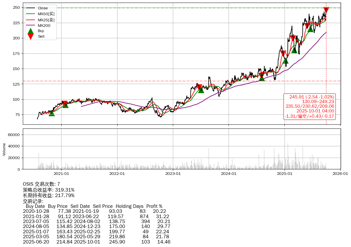 | 10 | OSIS | +319.31% | +217.79% | +101.52% | 7 | -1.31/偏空/+0.43/-0.17 | 2020-07-27~2025-10-01 |