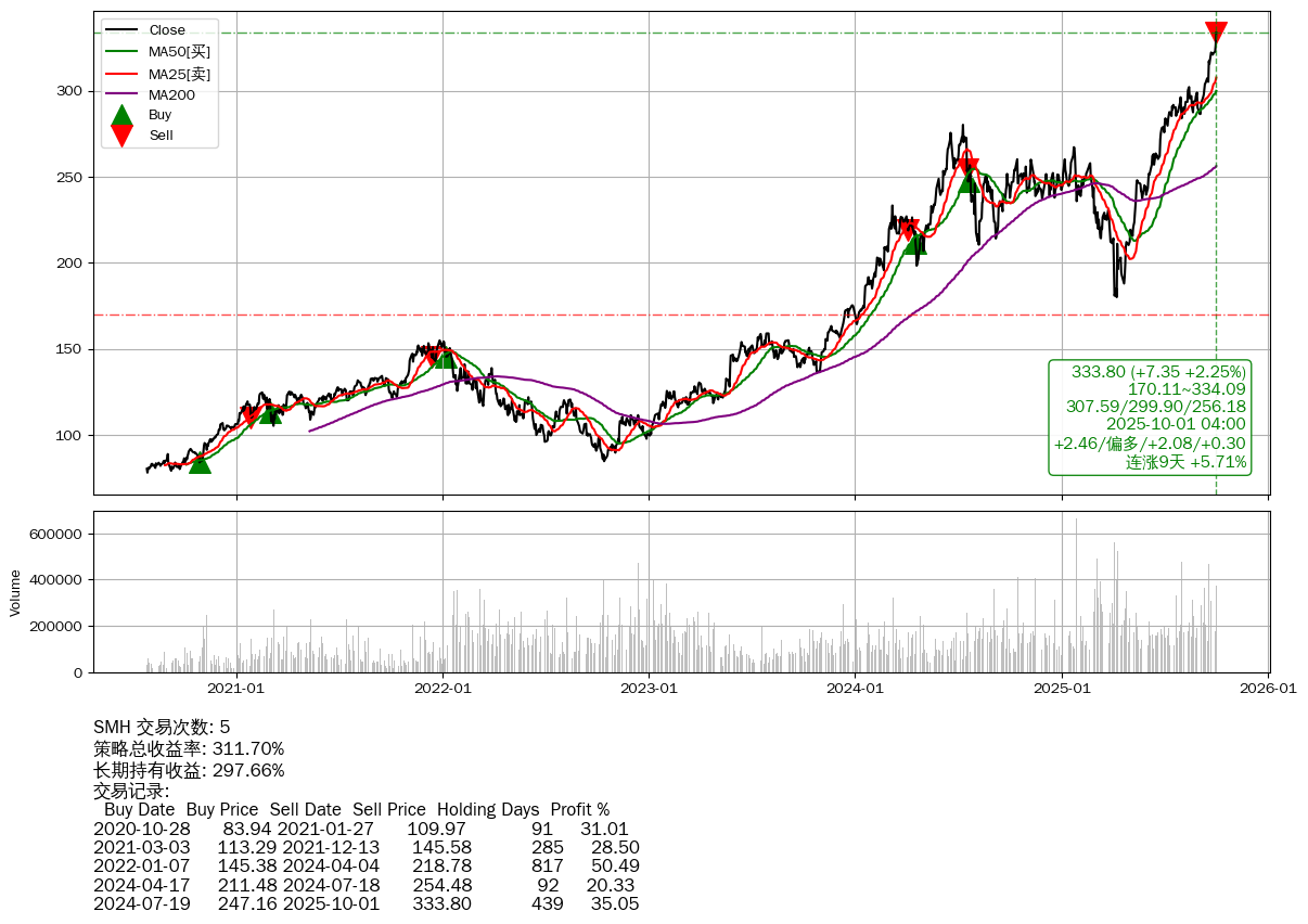 | 11 | ★SMH | +311.70% | +297.66% | +14.04% | 5 | +2.46/偏多/+2.08/+0.30 | 2020-07-27~2025-10-01 |