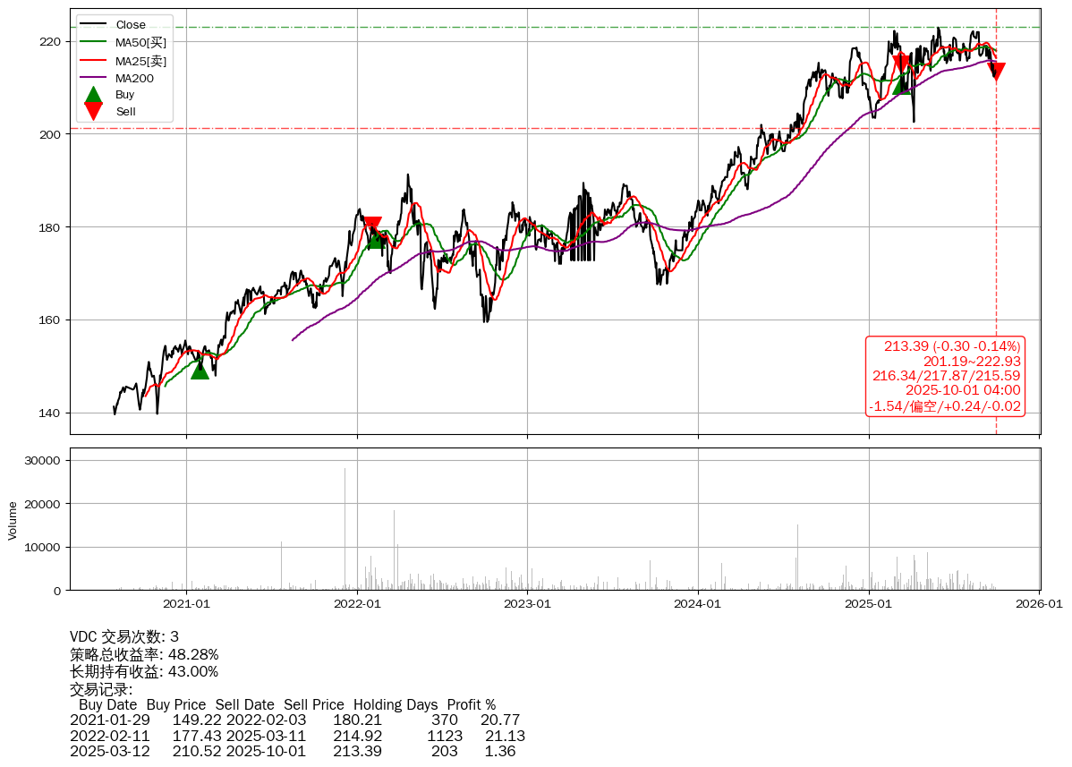 | 69 | ★VDC | +48.28% | +43.00% | +5.27% | 3 | -1.54/偏空/+0.24/-0.02 | 2020-07-29~2025-10-01 |
