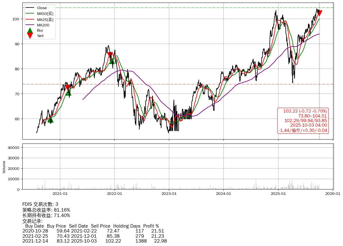 | 53 | ★FDIS | +81.16% | +71.40% | +9.76% | 3 | -1.44/偏空/+0.30/-0.04 | 2020-07-27~2025-10-03 |