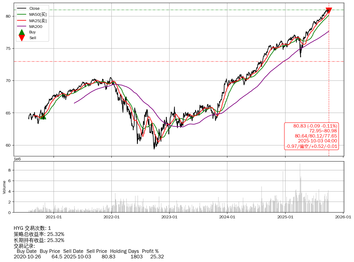 | 69 | ★HYG | +25.32% | +25.32% | +0.00% | 1 | -0.97/偏空/+0.52/-0.01 | 2020-07-27~2025-10-03 |
