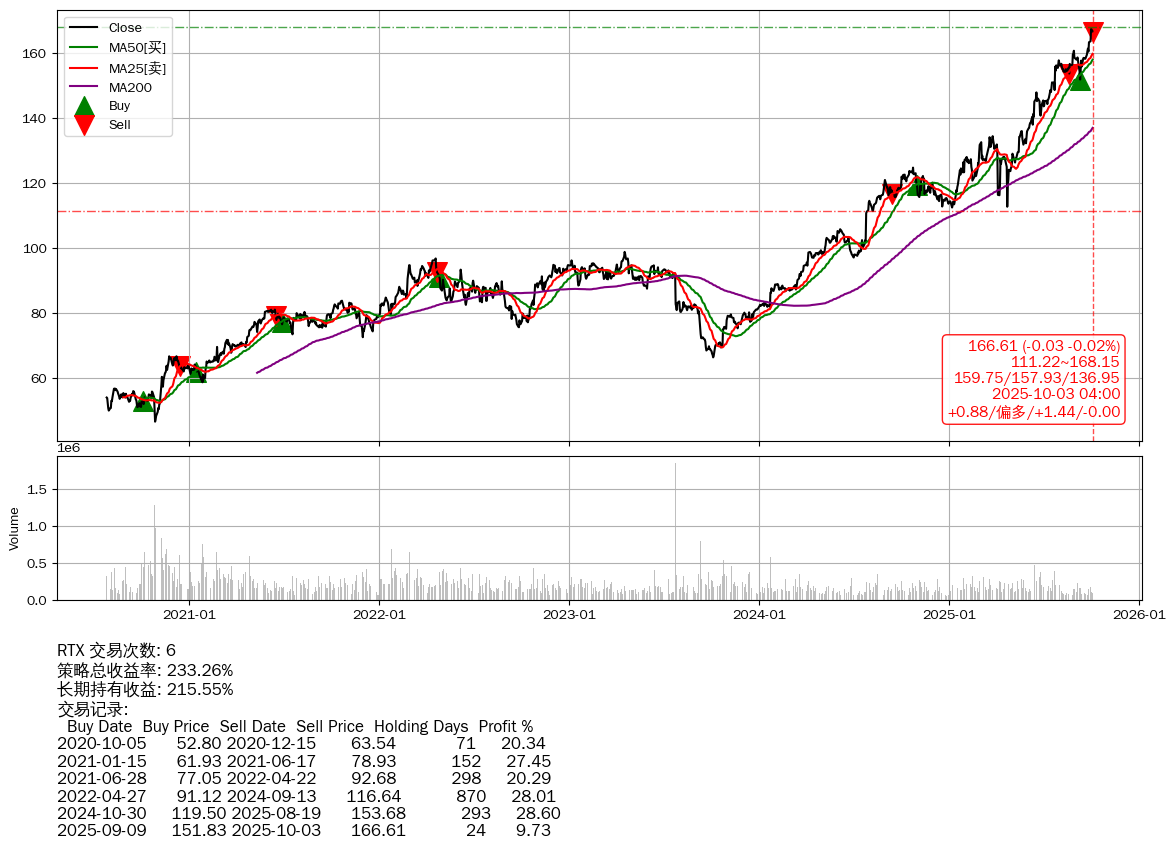 | 13 | ★RTX | +233.26% | +215.55% | +17.72% | 6 | +0.88/偏多/+1.44/-0.00 | 2020-07-27~2025-10-03 |