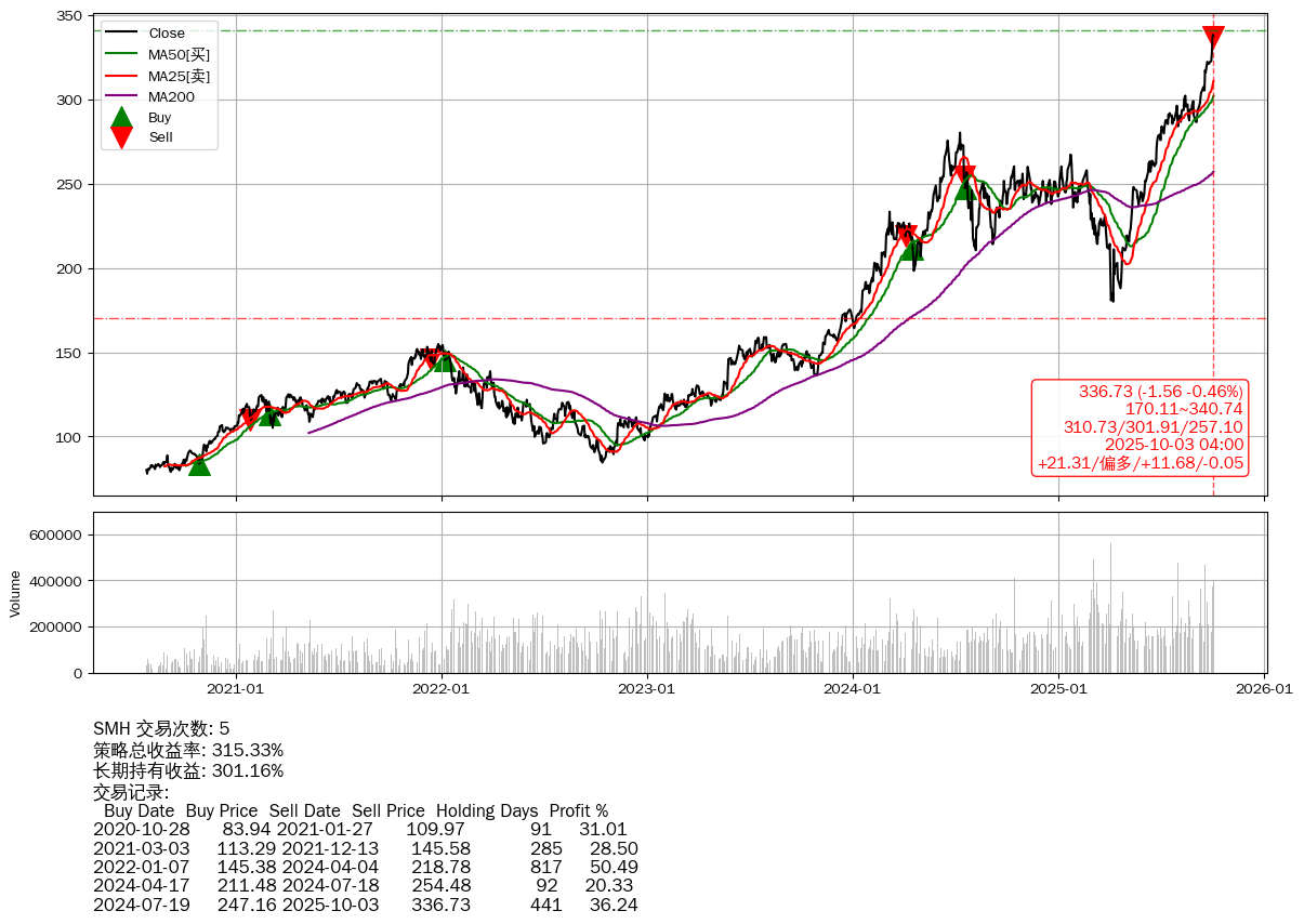 | 8 | ★SMH | +315.33% | +301.16% | +14.17% | 5 | +21.31/偏多/+11.68/-0.05 | 2020-07-27~2025-10-03 |