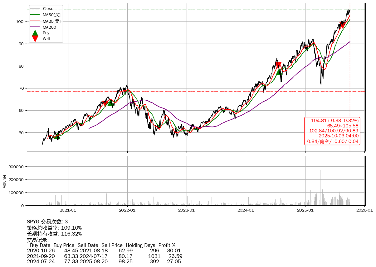 | 38 | ★SPYG | +109.10% | +116.32% | -7.22% | 3 | -0.84/偏空/+0.60/-0.04 | 2020-07-27~2025-10-03 |