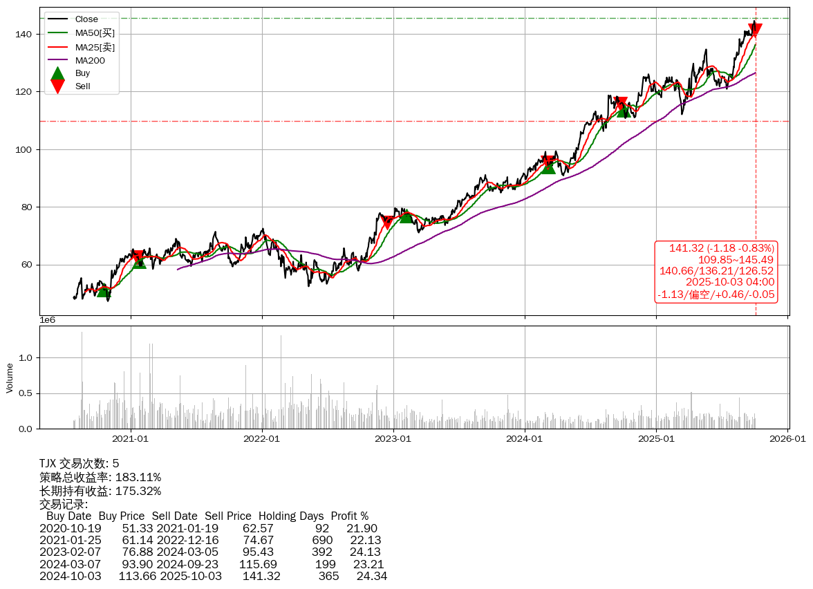 | 21 | ★TJX | +183.11% | +175.32% | +7.80% | 5 | -1.13/偏空/+0.46/-0.05 | 2020-07-27~2025-10-03 |