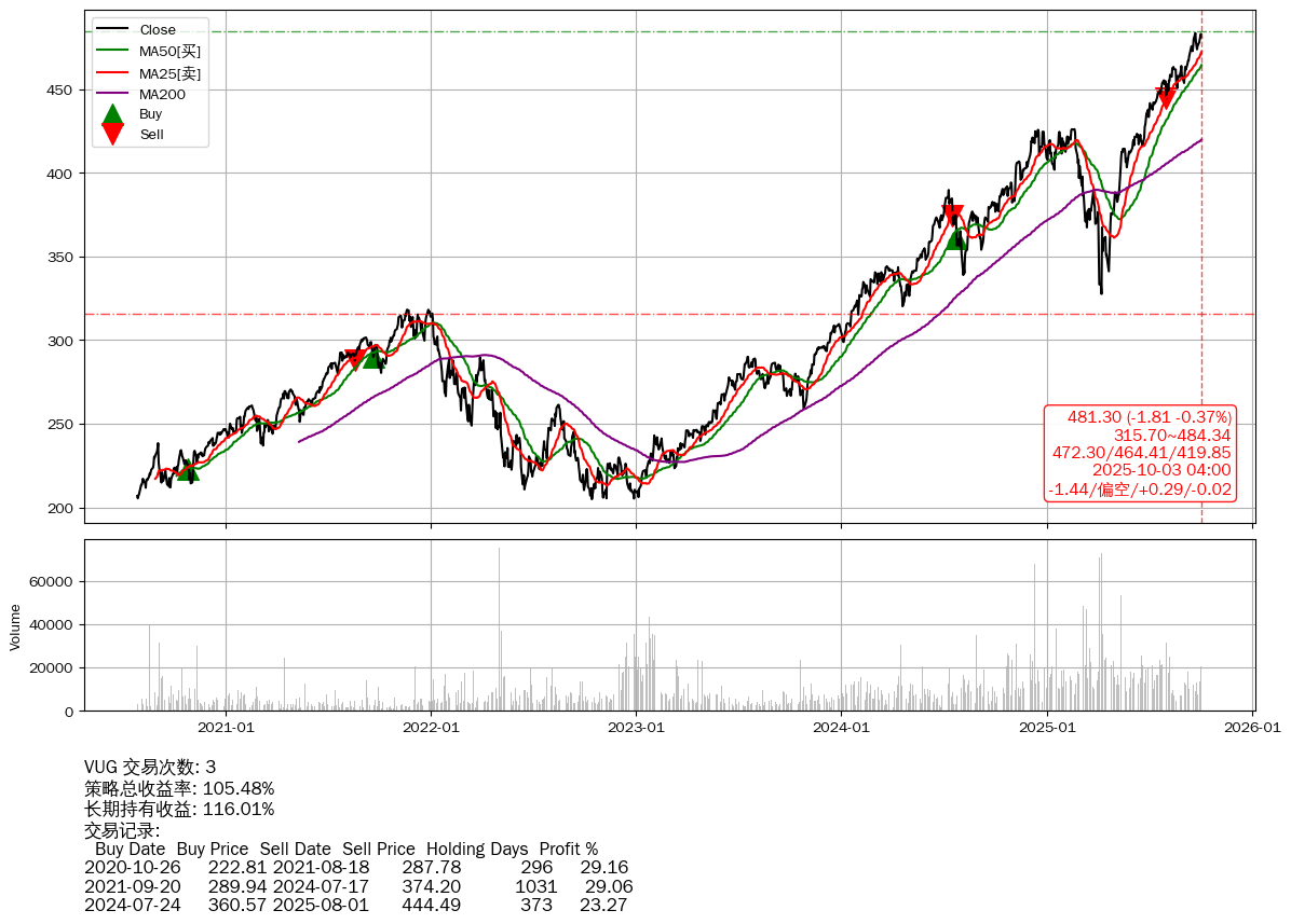 | 43 | ★VUG | +105.48% | +116.01% | -10.53% | 3 | -1.44/偏空/+0.29/-0.02 | 2020-07-27~2025-10-03 |