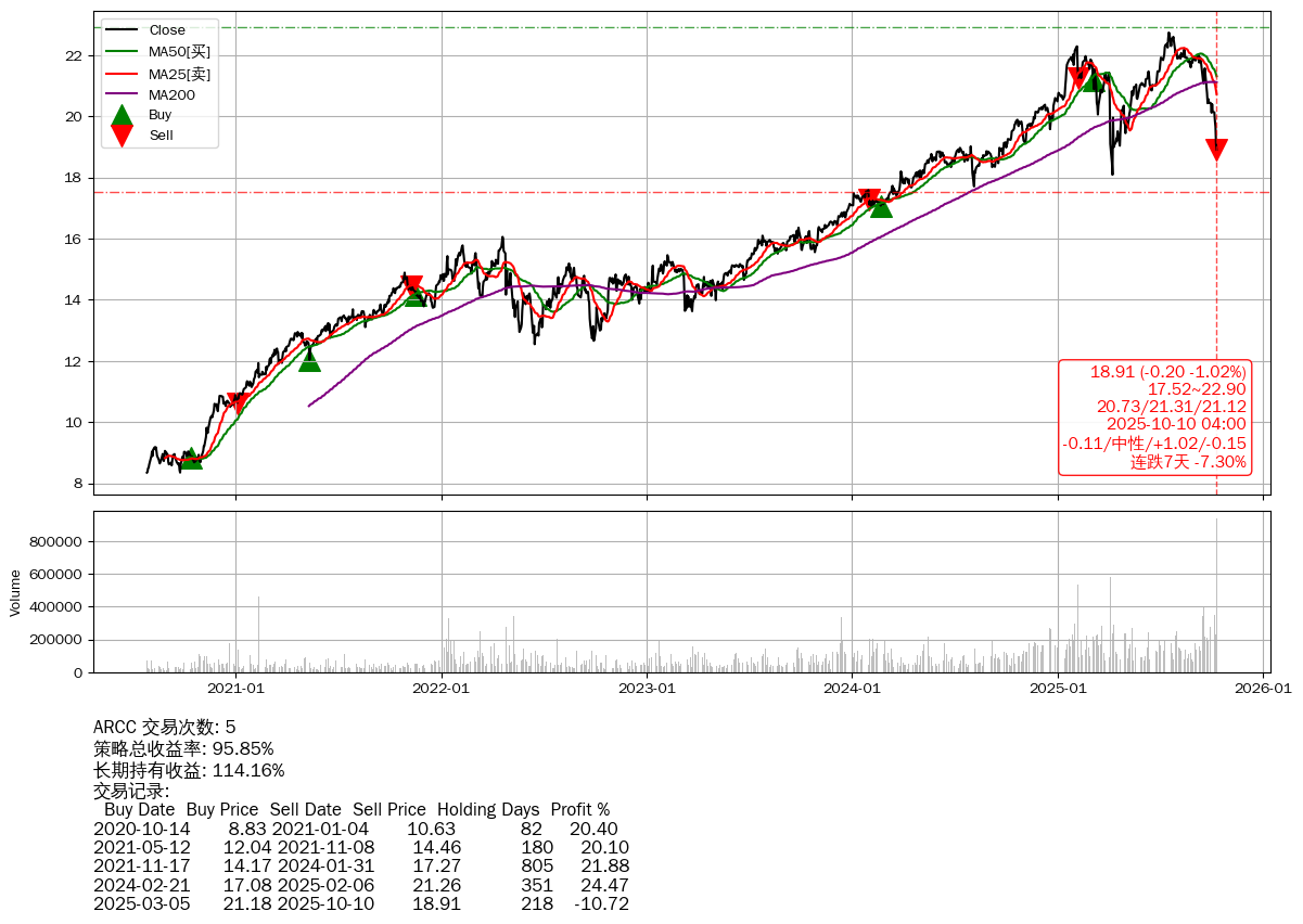 | 54 | ARCC | +95.85% | +114.16% | -18.31% | 5 | -0.11/中性/+1.02/-0.15 | 2020-07-27~2025-10-10 |
