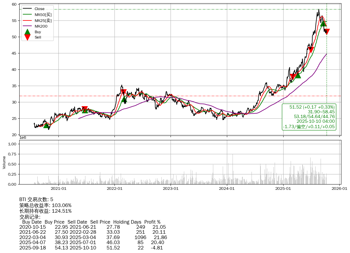 | 50 | BTI | +103.06% | +124.51% | -21.45% | 5 | -1.73/偏空/+0.11/+0.05 | 2020-07-27~2025-10-10 |