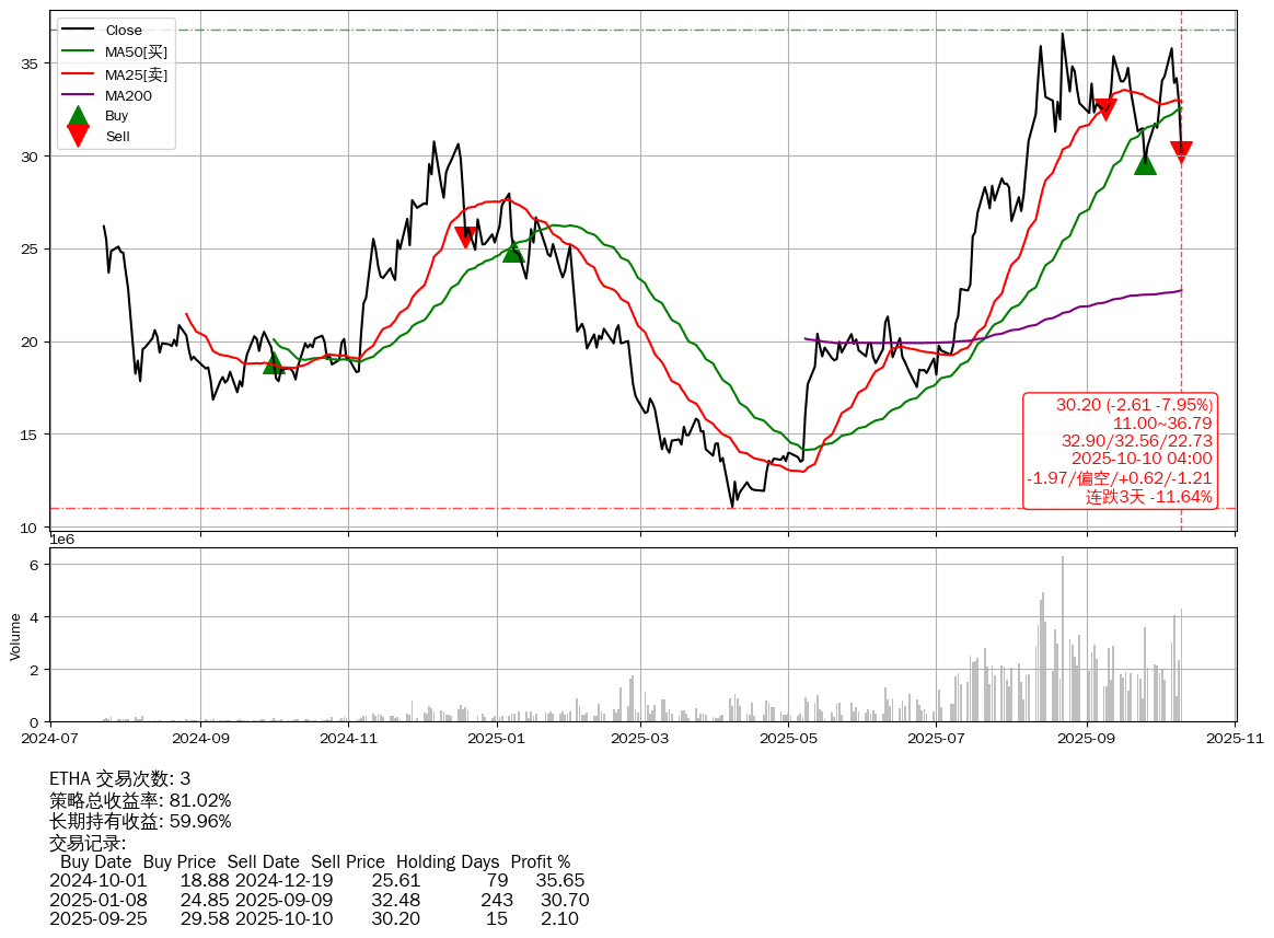 | ETHA | 2025-10-10 | 📉跌破 MA50 均线 📉连跌3天 -11.64% |