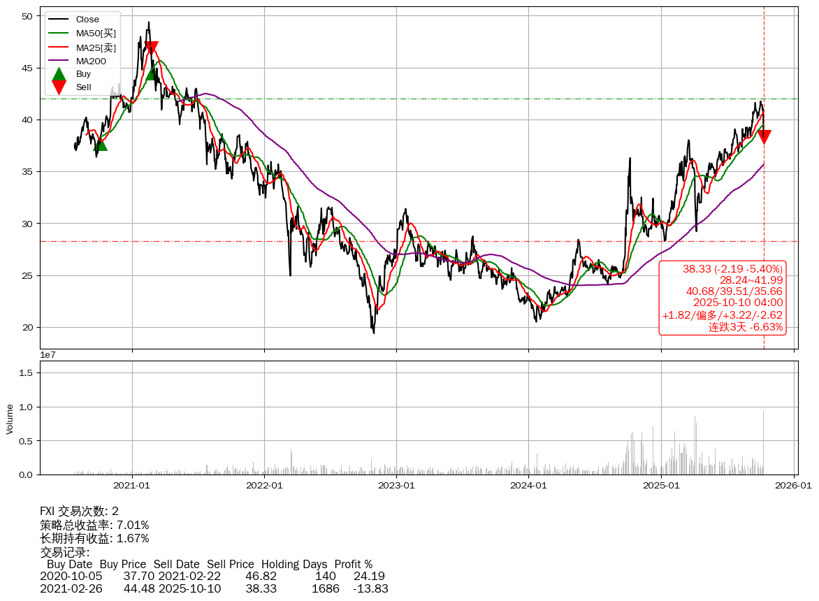 | 84 | ★FXI | +7.01% | +1.67% | +5.34% | 2 | +1.82/偏多/+3.22/-2.62 | 2020-07-27~2025-10-10 |