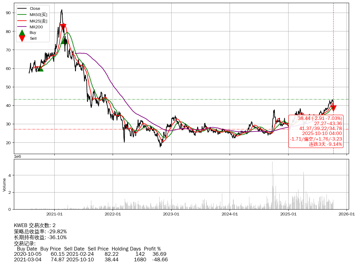 | 87 | ★KWEB | -29.82% | -36.10% | +6.28% | 2 | -1.71/偏空/+1.76/-3.23 | 2020-07-27~2025-10-10 |