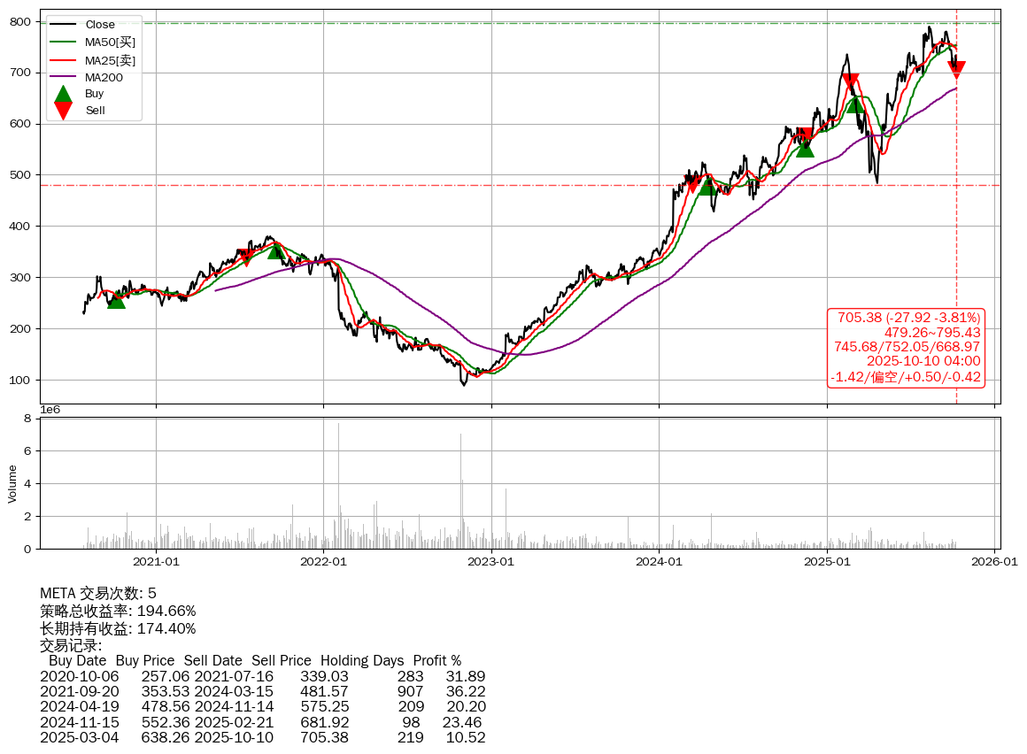 | 15 | ★META | +194.66% | +174.40% | +20.26% | 5 | -1.42/偏空/+0.50/-0.42 | 2020-07-27~2025-10-10 |
