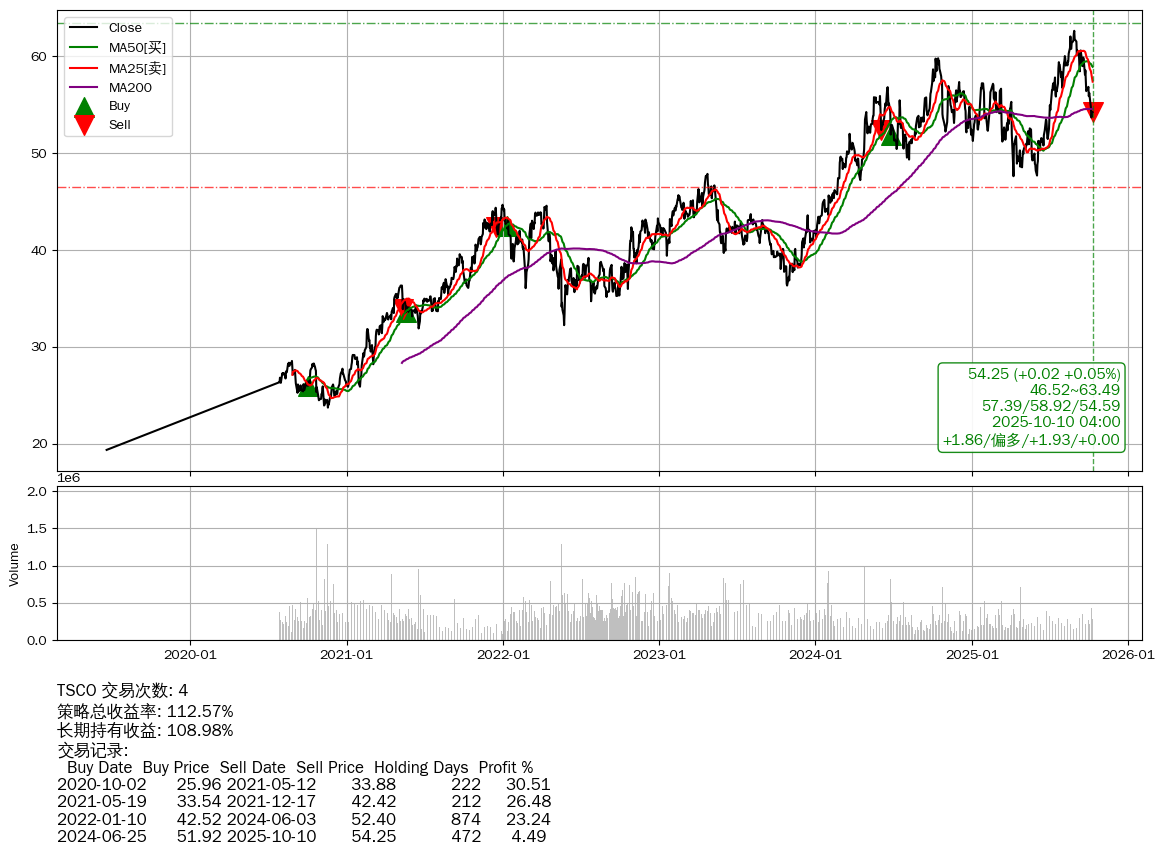 | 42 | TSCO | +112.57% | +108.98% | +3.59% | 4 | +1.86/偏多/+1.93/+0.00 | 2019-06-20~2025-10-10 |