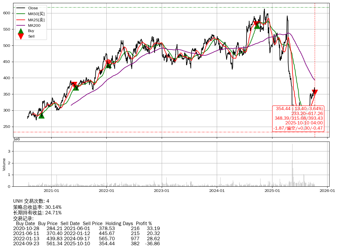 | 79 | ★UNH | +30.14% | +24.71% | +5.43% | 4 | -1.87/偏空/+0.30/-0.47 | 2020-07-27~2025-10-10 |