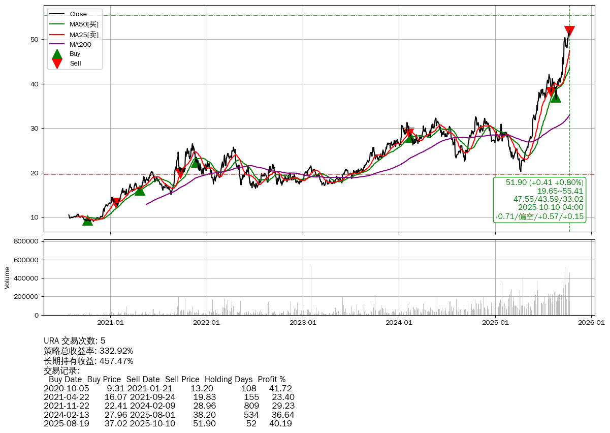 | 8 | ★URA | +332.92% | +457.47% | -124.55% | 5 | -0.71/偏空/+0.57/+0.15 | 2020-07-27~2025-10-10 |
