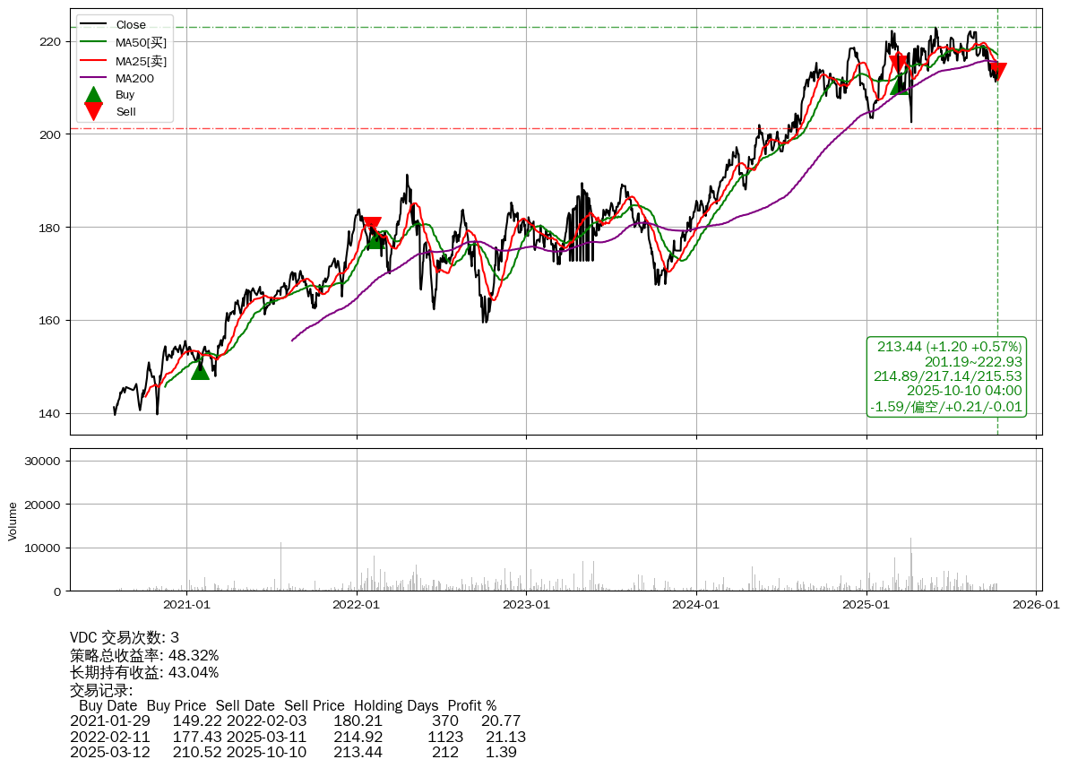 | 74 | ★VDC | +48.32% | +43.04% | +5.28% | 3 | -1.59/偏空/+0.21/-0.01 | 2020-07-29~2025-10-10 |