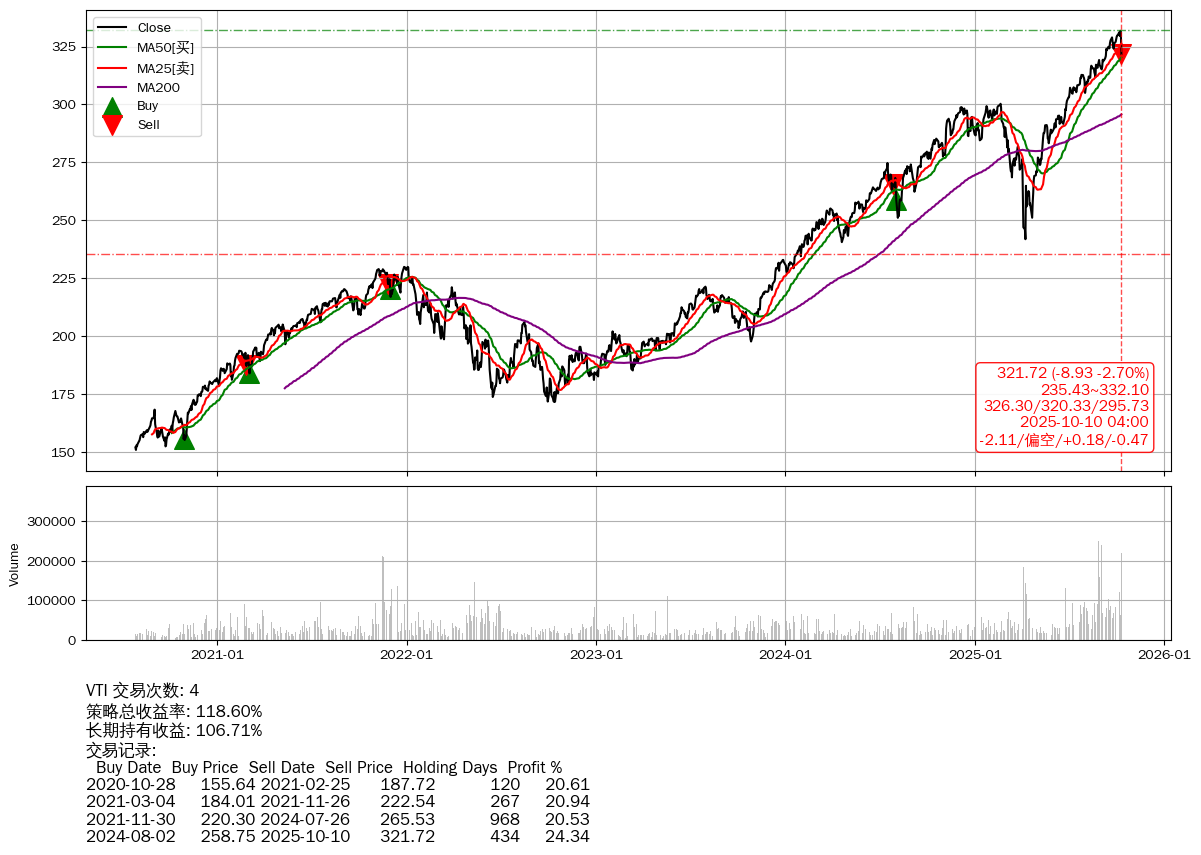 | 37 | ★VTI | +118.60% | +106.71% | +11.90% | 4 | -2.11/偏空/+0.18/-0.47 | 2020-07-27~2025-10-10 |