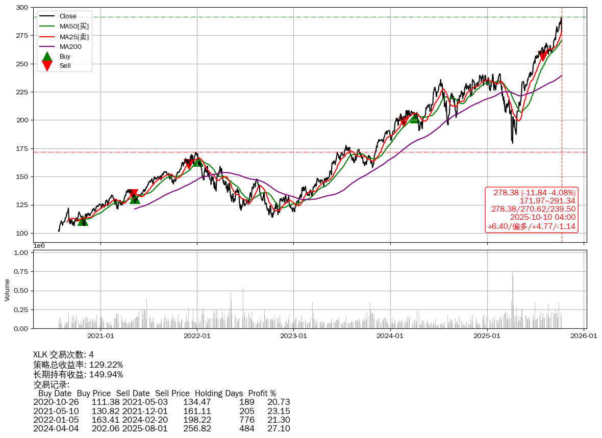 | 33 | ★XLK | +129.22% | +149.94% | -20.72% | 4 | +6.40/偏多/+4.77/-1.14 | 2020-07-27~2025-10-10 |