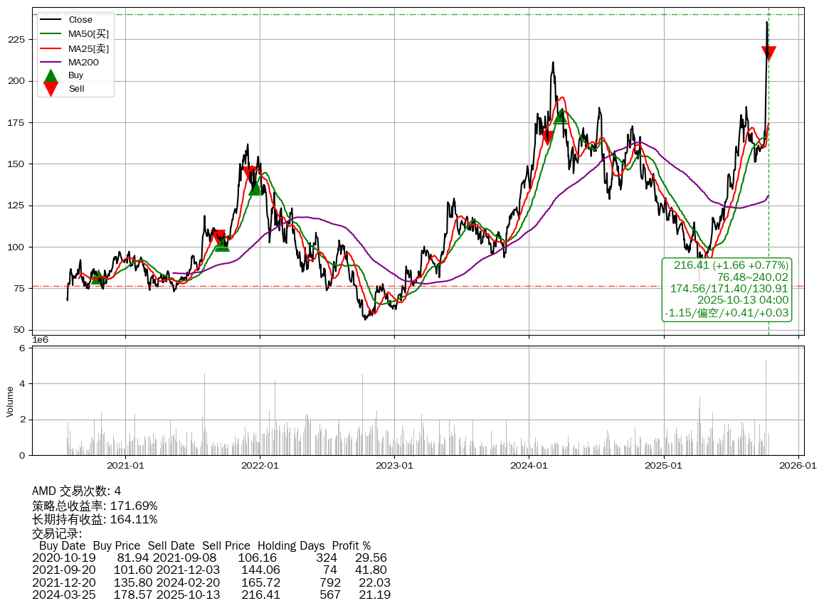 | 25 | ★AMD | $216.41(+1.80 +0.84% 2025-10-13 15:59) | 📉回撤 2025-10-09 -8.09% (4天) 214.75(2025-10-10) → 235.47(2025-10-08) (-8.80%) | +171.69% | +164.11% | +7.59% | 4 | 偏空/0.41/0.03 | 2020-07-27~2025-10-13 |
