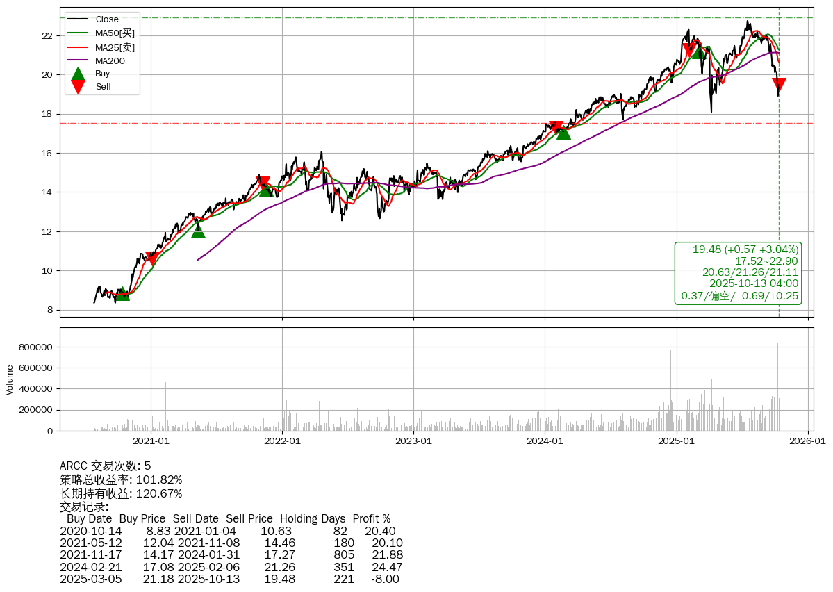 | 53 | ARCC | $19.49(+0.58 +3.07% 2025-10-13 15:59) | 📈涨破 MA5 均线 📉回撤 2025-07-18 -14.31% (87天) 18.91(2025-10-10) → 22.74(2025-07-17) (-16.84%) | +101.82% | +120.67% | -18.85% | 5 | 偏空/0.69/0.25 | 2020-07-27~2025-10-13 |