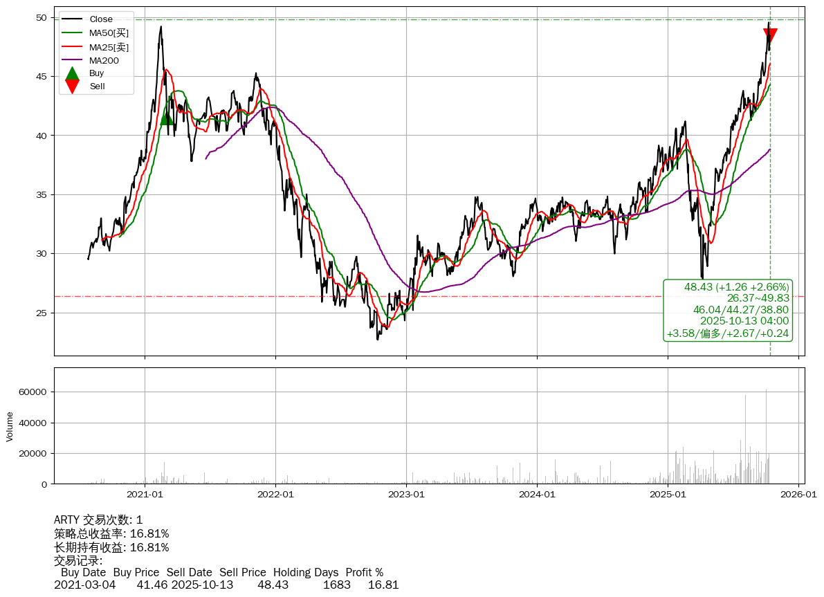 | 86 | ★ARTY | $48.40(+1.24 +2.63% 2025-10-13 15:59) | 📈涨破 MA10 均线 📉回撤 2025-10-10 -2.26% (3天) 47.17(2025-10-10) → 49.55(2025-10-09) (-4.79%) | +16.81% | +16.81% | -0.00% | 1 | 偏多/2.67/0.24 | 2020-07-27~2025-10-13 |