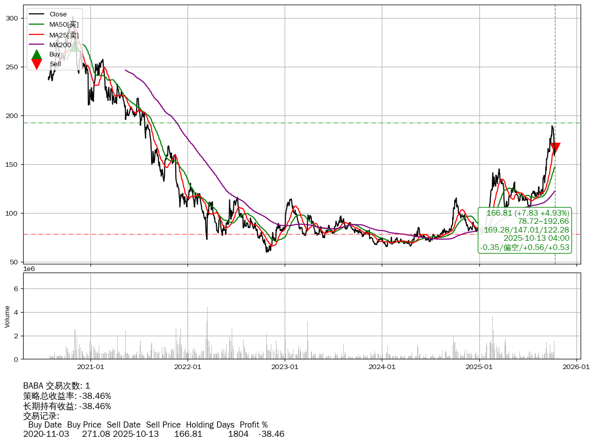 | 91 | ★BABA | $166.80(+7.80 +4.91% 2025-10-13 15:59) | 📉回撤 2020-10-28 -44.62% (1811天) 59.93(2022-10-24) → 301.20(2020-10-27) (-80.10%) | -38.46% | -38.46% | +0.00% | 1 | 偏空/0.56/0.53 | 2020-07-27~2025-10-13 |