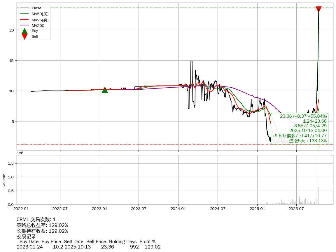 | 36 | CRML | $23.28(+8.29 +55.31% 2025-10-13 15:59) | 📈连涨5天 +133.13% | +129.02% | +129.02% | +0.00% | 1 | 偏多/0.41/10.77 | 2022-02-17~2025-10-13 |