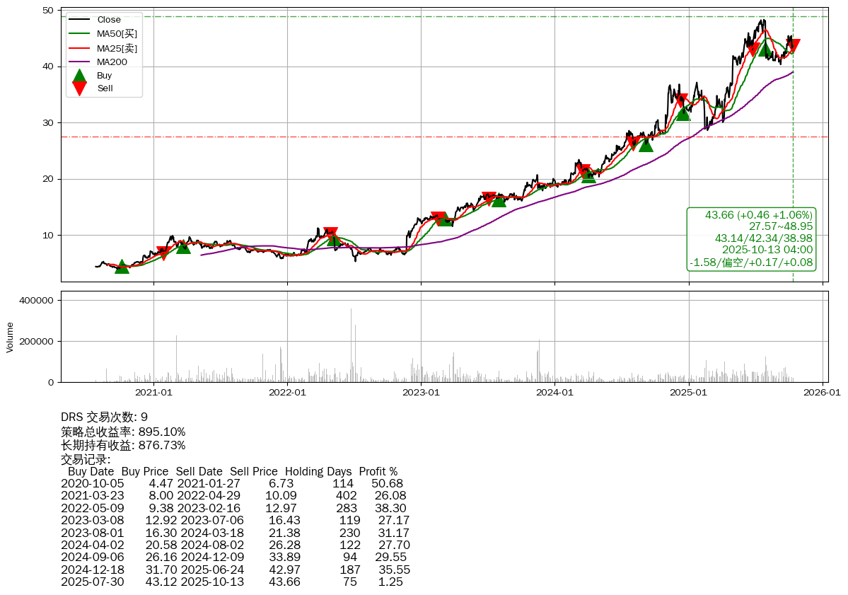 | 12 | ★DY | $290.90(+6.43 +2.26% 2025-10-13 15:59) | 📈涨破 MA5/10 均线 📉回撤 2025-09-30 -1.14% (13天) 284.43(2025-10-10) → 294.35(2025-09-29) (-3.37%) | +281.78% | +358.04% | -76.25% | 5 | 偏空/0.11/0.13 | 2020-07-27~2025-10-13 |