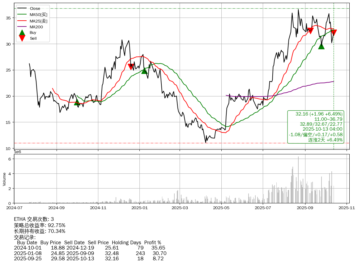 | 57 | ★ETHA | $32.17(+1.97 +6.52% 2025-10-13 15:59) | 📈连涨2天 +6.49% 📉回撤 2025-08-25 -12.08% (49天) 29.58(2025-09-25) → 36.58(2025-08-22) (-19.14%) | +92.75% | +70.34% | +22.42% | 3 | 偏空/0.17/0.58 | 2024-07-23~2025-10-13 |